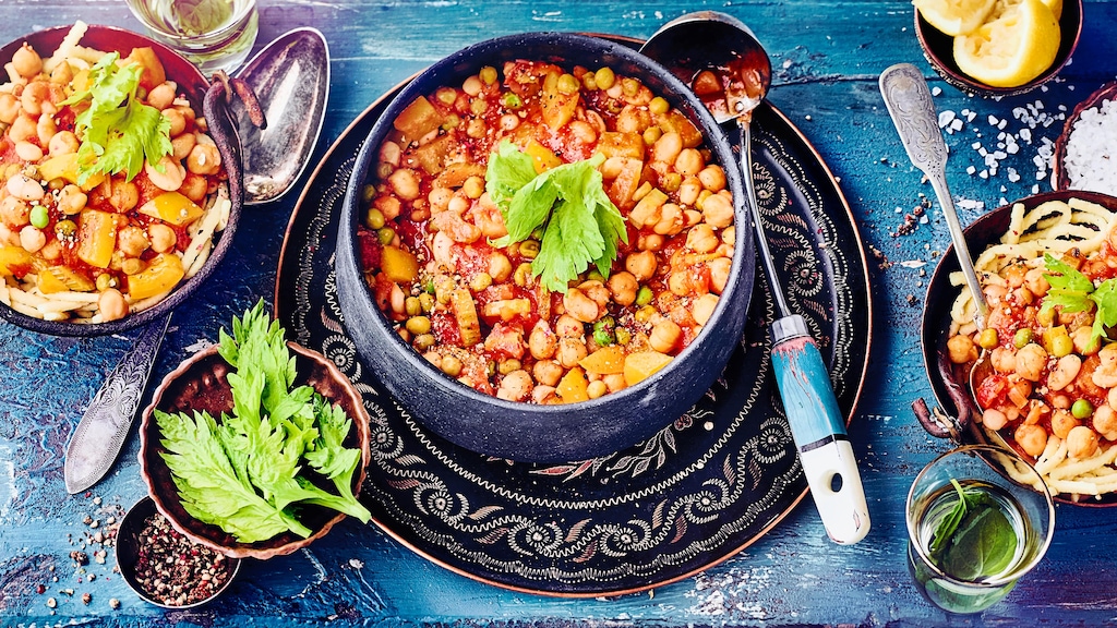 Ein Hauch von Orient: Probieren Sie unsere tunesische Erbsensuppe mit Sellerie, Paprika, Kichererbsen und Bohnenkernen – vegetarisch und lecker!