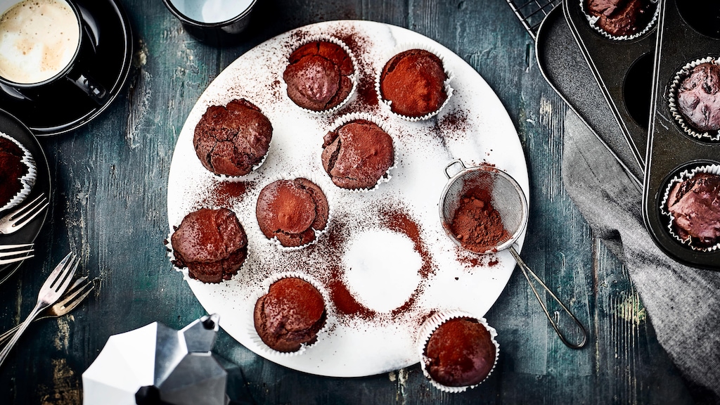 Vegane Schokomuffins aus dem Ofen nehmen, kurz abkühlen lassen und servieren.