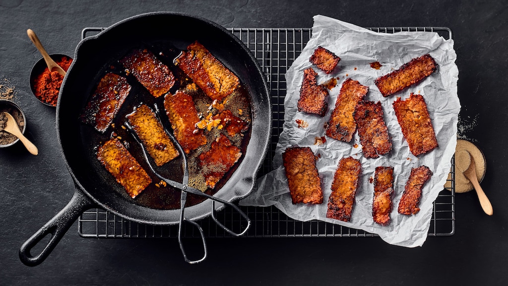 Dass Sie für unseren veganen Bacon statt Tofu Tempeh verwenden, hat einen besonderen Vorteil. Proteine liefert auch Tofu. Dank der Fermentierung erleichtert Tempeh es dem Körper jedoch, die Eiweiße aufzunehmen. Gleichzeitig bringt die indonesische Spezialität mehr Biss mit als Tofu: perfekt für veganen Bacon. Schließlich entscheidet auch die Textur über die Wahrnehmung.
