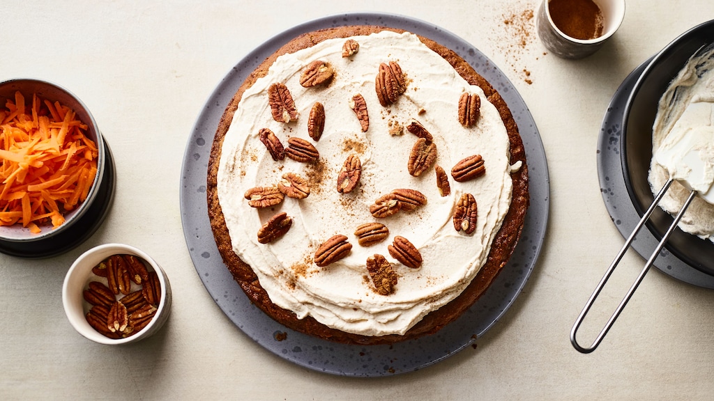 Während der Kuchen im Ofen ist, können Sie das Topping herstellen. Für das Frosting unseres veganen Karottenkuchens verwenden wir als Basis veganen Frischkäse und vegane Sahne. Zimt harmoniert wunderbar mit Nüssen und Möhren, deshalb ist dieses beliebte Backgewürz wichtiger Bestandteil von Teig und Topping. Nach dem Abkühlen wird der Karottenkuchen mit der Zimtcreme bestrichen und mit gerösteten Pekannüssen belegt – ein „krönender“ Abschluss für einen gelungenen Nachtisch!
