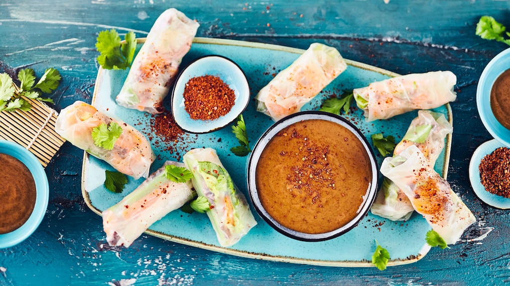 Die Frühlingsrollen mit dem Dip und frischem Koriander servieren.