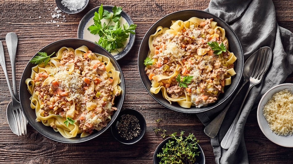 Tipp: Natürlich eignen sich für dieses Rezept auch vegane Ersatzprodukte wie Tofu-Hack und pflanzliche Sahne. Sie können zum Beispiel unser Rezept für vegetarische Sauce bolognese in eine „weiße“ Variante abwandeln.