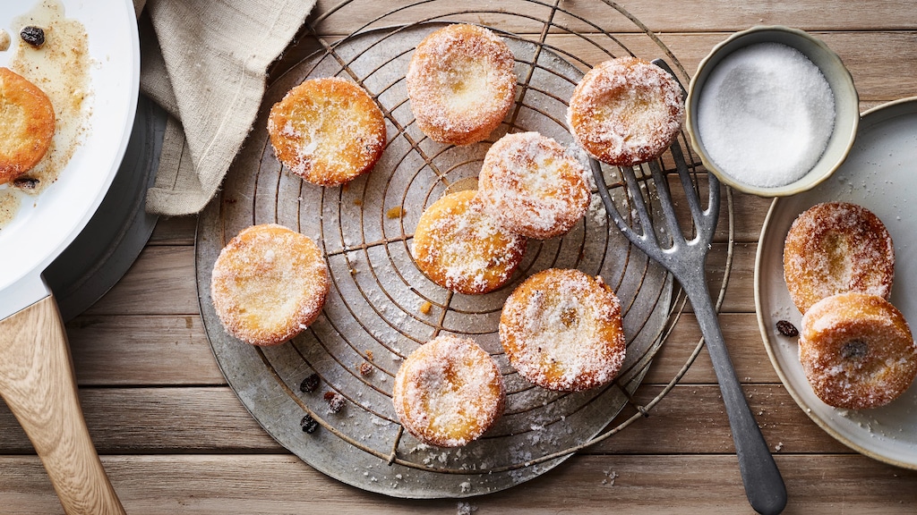 Portionsweise ausreichend Öl in einer beschichteten Pfanne erhitzen und die Teigküchlein für 2-3 Minuten pro Seite goldbraun ausbacken. Auf Küchenpapier abtropfen lassen.