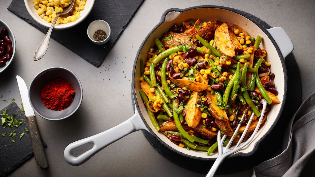 Unsere Westernpfanne ist schnell zubereitet: Nach nur einer halben Stunde können Sie sie bereits servieren. Damit das Rezept auch wirklich innerhalb dieser kurzen Zeitspanne gelingt, sollten Sie auf festkochende Kartoffeln für Ihre Westernpfanne setzen. Die besitzen weniger Stärke als mehlige Kartoffeln – und behalten beim Garen daher ihren Biss. So stimmt nicht nur die Geschmackszusammensetzung unserer Westernpfanne, auch die Konsistenzen ergänzen sich optimal. Grüne Bohnen und Mais übernehmen den knackigen Part, während die bissfesten Kartoffeln die Brücke zu den angenehm weichen Kidneybohnen schlagen.