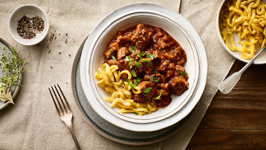 Übrigens: Als Beilage servieren wir Spätzle zu unserem einfachen Rezept für Wildschweingulasch. Auch Kartoffelklöße, Semmelknödel oder Kartoffelpüree passen hervorragend dazu und runden das Gericht ab. Haben Sie Lust auf eine Gemüsebeilage, empfehlen wir Ihnen zum Beispiel Rotkohl oder Rosenkohl.