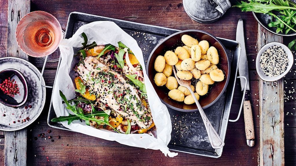 Dazu passen kleine krosse Kartoffel-Gnocchi. Halbieren Sie dafür jeweils die Gnocchi und braten Sie sie in Rapsöl bei mittlerer Temperatur goldbraun.