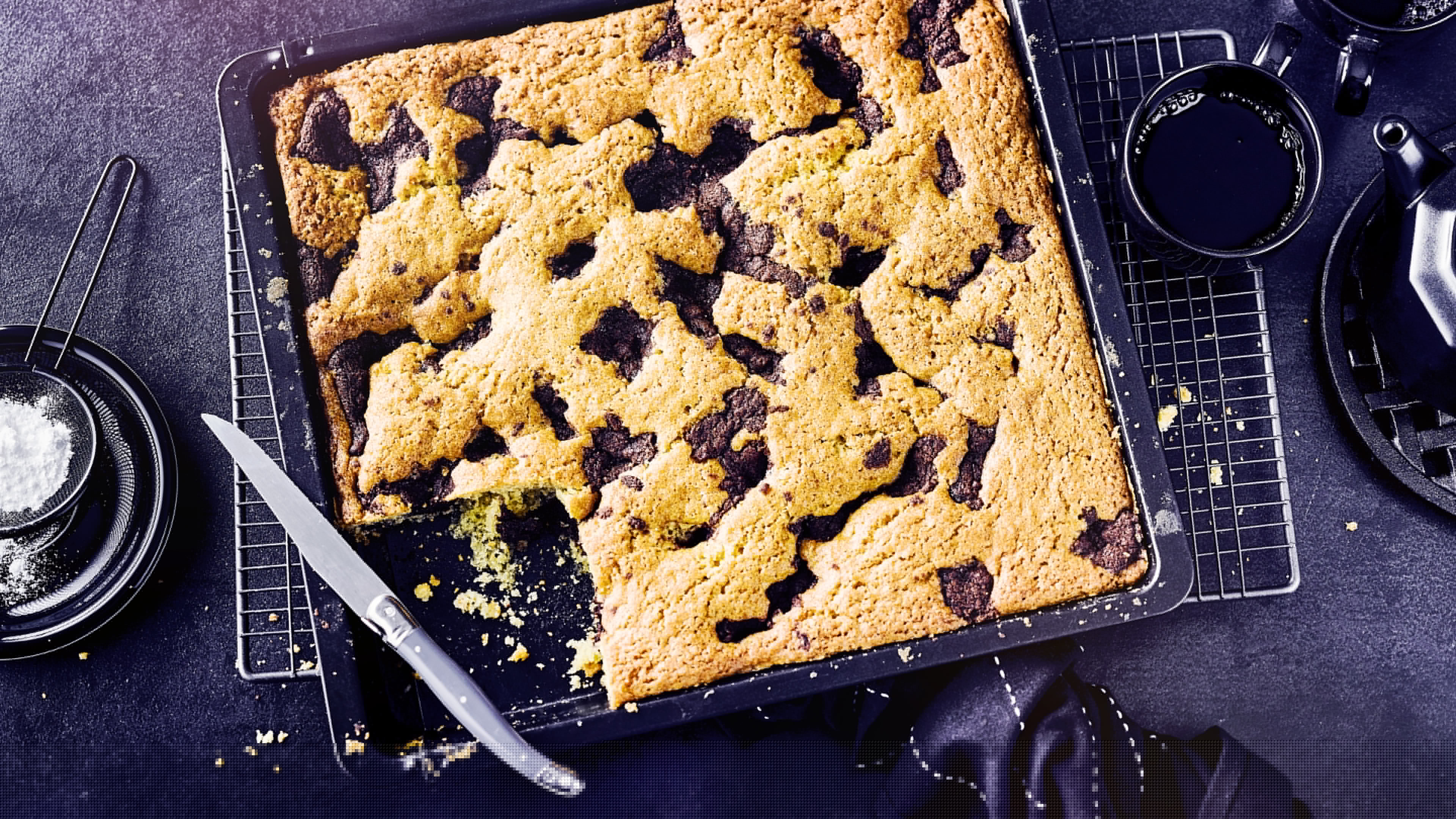 Backkakao, Butter, Zucker sowie das restliche Mehl miteinander verkneten und fleckenförmig auf dem Teig verteilen. Den Kuchen für 25-30 Minuten goldbraun backen.