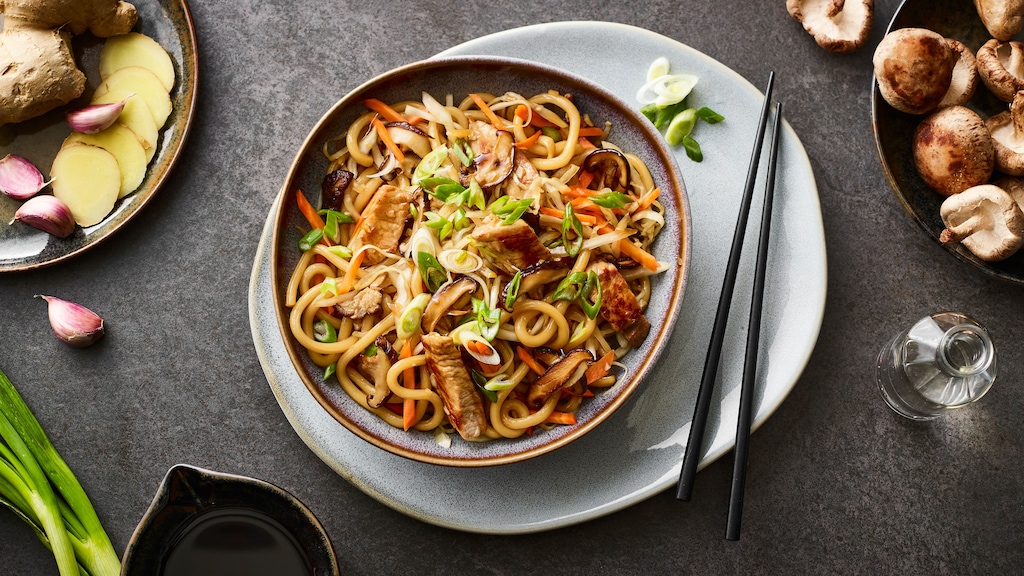 Nicht fehlen darf beim Yaki Udon die Soße. Die beliebte Mentsuyu-Soße aus Reiswein, Soja-Soße, Dashi-Brühe und Zucker. Beim Yaki Udon werden die Nudeln zunächst gekocht und dann zusammen mit den anderen Zutaten in der Mentsuyu gebraten. Wir servieren das Yaki Udon mit Möhren, Weißkohl, Shiitake-Pilzen – übrigens auch Teil unseres Omuraisu-Rezepts – und Schweinefleisch. Sie können Ihrer kulinarischen Fantasie hier aber freien Lauf lassen, denn Nudeln und Soße sind offen für alles.