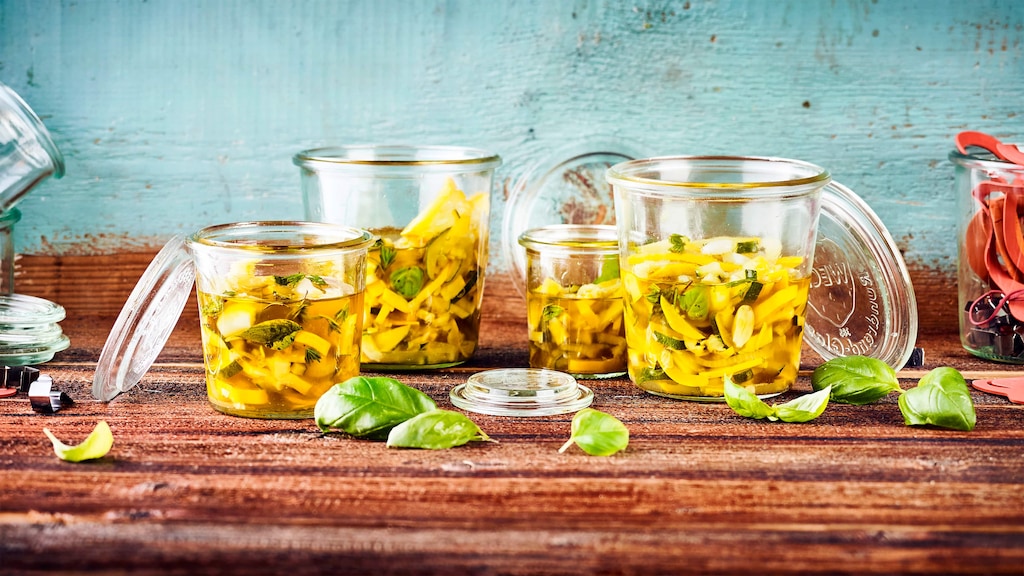 Apfelessig und Olivenöl bilden eine hervorragende Basis, wenn Sie Zucchini einlegen. Dazu kommen frische Kräuter: Thymian und Basilikum, Salz, Pfeffer sowie Knoblauch – und schon haben Sie alles zusammen, was Sie für unser Zucchini-Antipasti-Rezept brauchen. Kompliziert ist dabei nichts: Alles aufkochen und fertig ist die Vorspeise. Um die Zucchini-Antipasti danach sicher verschlossen einzulegen, verwenden Sie ein sterilisiertes Glas. Dafür füllen Sie beispielsweise ein Einmachglas mit kochendem Wasser, lassen es eine Minute stehen, leeren es und lassen alles lufttrocknen. Unser EDEKA-Kochexperte verrät Ihnen auch, wie Sie Gemüse in Öl einlegen können, und empfiehlt, alles gut verschlossen an einem kühlen und dunklen Ort aufzubewahren. Je nach Öl sind Zucchini-Antipasti dann bis zu einem Jahr haltbar – und Sie sind damit jederzeit vorbereitet, um mit unserer Zucchini-Vorspeise einen italienischen Abend einzuläuten. Danach etwas Pasta, vielleicht noch Fisch und zum Nachtisch Früchte oder Tiramisu. Gleichzeitig können Sie unsere Zucchini-Antipasti mit anderen italienischen Vorspeisen, beispielsweise eingelegten Artischocken und Auberginen, kombinieren. So einfach kann italienischer Vorspeisen-Genuss sein! Ganz frei von tierischen Produkten beginnen Sie Ihr Menü darüber hinaus mit unseren veganen Vorspeisen.