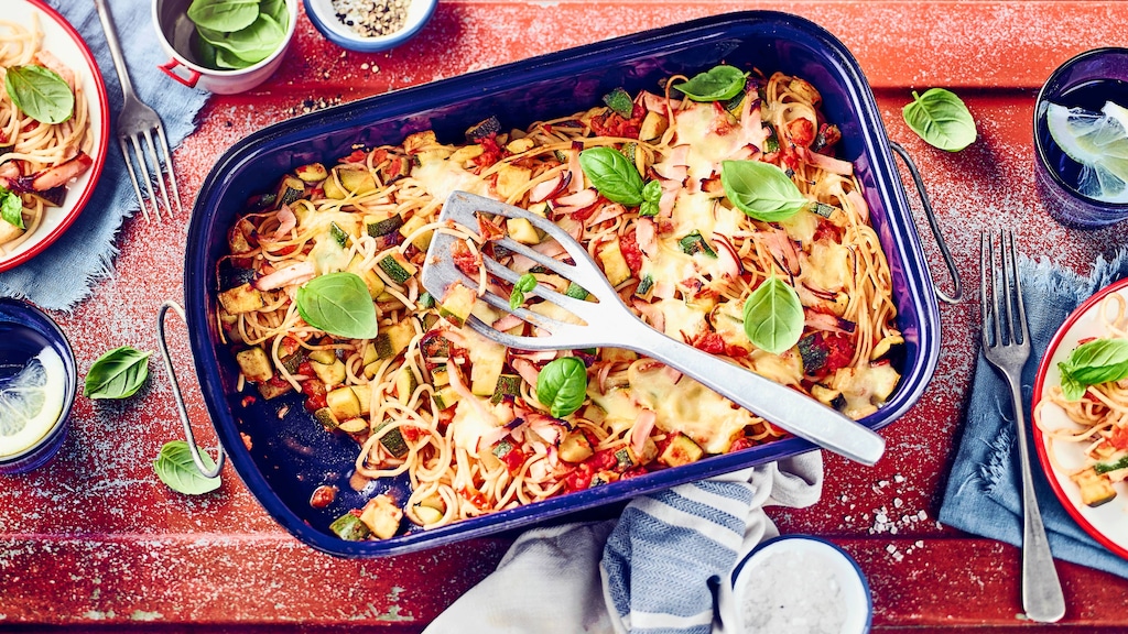 Mit einer Käsekruste schmecken Nudeln besonders lecker. Die weiteren Zutaten für Ihr Spaghetti-Auflauf-Rezept können Sie immer wieder neu kombinieren – verwenden Sie beispielsweise Putenbruststreifen und Zucchini.